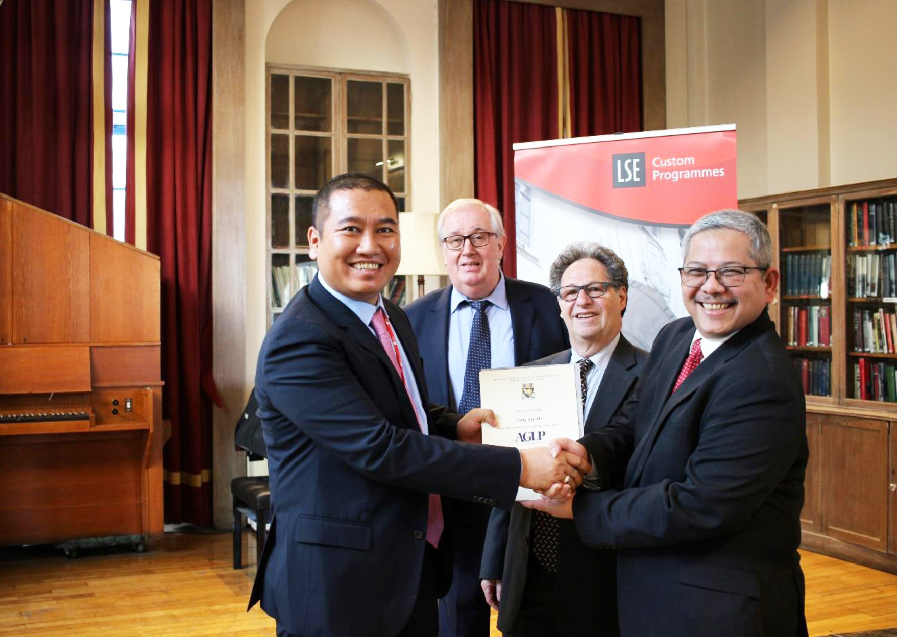 A Memorable Week in LSE for AGLP- Our Chairman, U Aung Zaw Oo receiving his certificate of attendance from (L-R) AGLP LSE Academic Co Directors, Prof. Mick Cox, Prof. Saul Estrin, HE Indonesia Ambassador Dr. Rizal Sukma